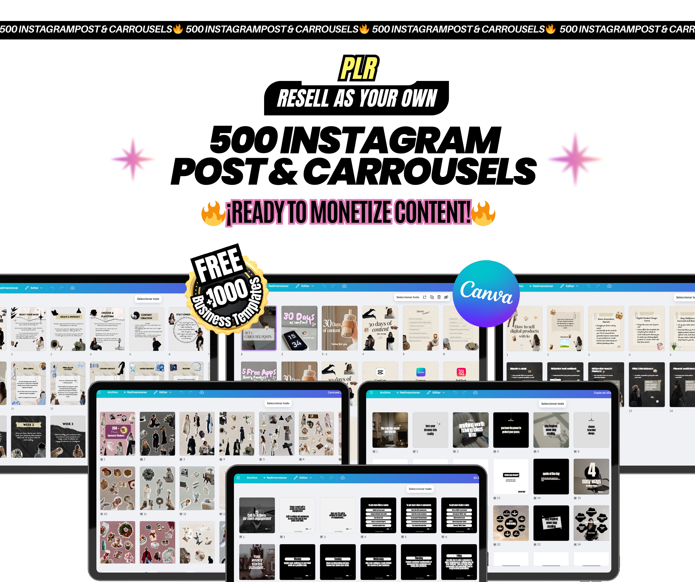 ✨ This bundle gives you 500 Instagram Carousel Templates + 350 Stickers 💖 Fully editable in Canva with PLR + MRR—ready to resell, rebrand, or use to grow your brand. Perfect for creators, coaches & social media managers who want scroll-stopping feeds *and* passive income.
